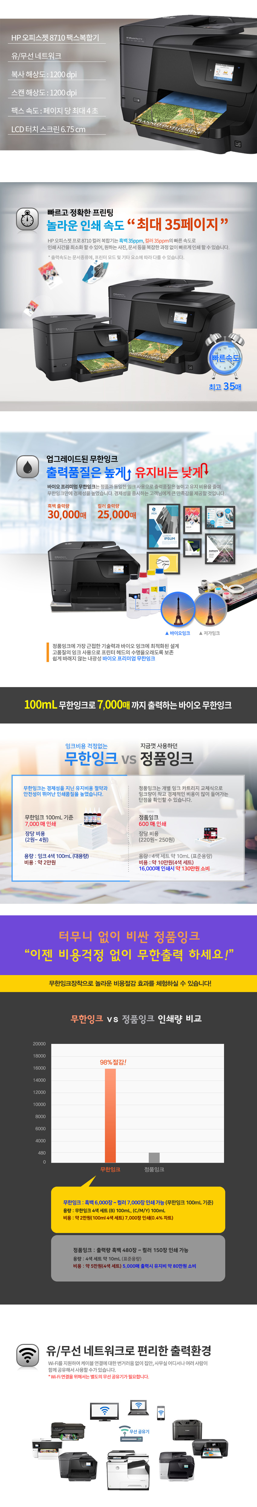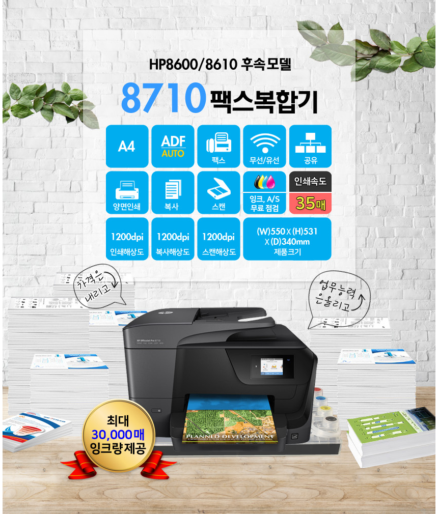 HP 8710무칩버전/ 8710 잉크포함 저렴한 상품 잉크젯복합기 사무용 팩스 대용량잉크