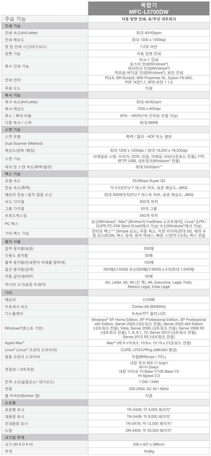 브라더 A4 흑백레이저복합기 MFC-L5700DW